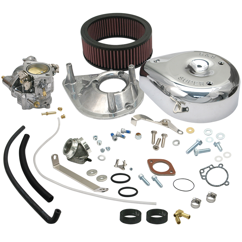 Fitment: 1979-'85 XL Models Note: Not For Models With Vertical Magneto. Features and benefits: Four fuel delivery ports – Better throttle response O-ring sealed idle mixture screw • Increased air flow for more power Super E 1 7/8" (47.6mm) bore – for engines up to 100" displacement Adjustable enrichment starting system –does not restrict air flow like a conventional choke Adjustable accelerator pump S&S chrome teardrop air cleaner Two cable throttles required – see notes Kit Contents: Super E or G carburetor assembly Manifold for stock height engine Manifold seals and clamps S&S chrome teardrop air cleaner kit All gaskets, hoses, and required hardware for installation Complete installation and tuning instructions Notes: 1979-'80 engines may be equipped with either o-ring or band style heads. Check before ordering. Not legal for sale or use on CA or EPA pollution controlled motorcycles.