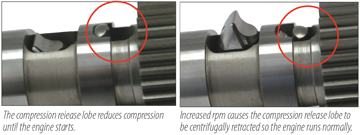 The heart of our Easy Start cams is a centrifugally retracted, spring loaded, compression release lobe milled into the heel of each exhaust lobe. At cranking speeds, the lobe bumps the exhaust valve open slightly during the compression stroke, making the engine much easier to turn over. Once the engine fires and reaches 800 RPM, the lobe swings out of the tappet roller path, allowing the engine to run normally and with full compression.